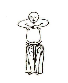 ①预备桩功:两脚平行站立,与肩等宽,双膝微屈,两臂自然下垂于身体两侧,五指自然并拢微屈,两眼平视前方,继而放松,轻轻闭合,眼若垂帘。心平气和,神能安详,洗心涤滤,心澄貌恭。全身自上而下头颈、肩、臂、平、胸、腹、臀、大腿、小腿、脚依次放松,躯体各关节及内脏放松,做到身无紧处,心无杂念,神意内收。