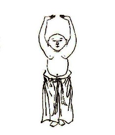 诀曰:两手齐持脑,垂腰至膝间;头惟探胯下,口更齿牙关;掩耳聪教塞,调元气自闲;舌尖还抵腭,力在肘双弯。