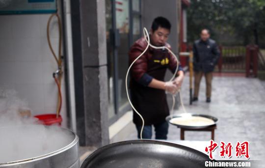 重庆12月11日电 (刘渝)重庆一小面馆师傅上演绝活,一根面条50米,一碗面只有一根面。这家“一根面”面馆位于南岸区,只见面馆师傅赵明曦,将面条向天空抛去,面条在空中划出起伏的弧线,最高离地约两三米,最后面条稳稳落入沸腾的大锅灶内。两分钟后,将面捞起,热辣鲜香,劲道十足。